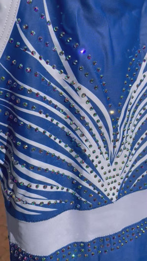 As the frost shimmers on a cold winter morning, your determination reveals its strength to conquer new goals! A bold royal blue color, with white, is accented with rhinestones and has a lovely strappy back design. Mesh insert around the center, fully lined. Whole leotard is Fully Lined